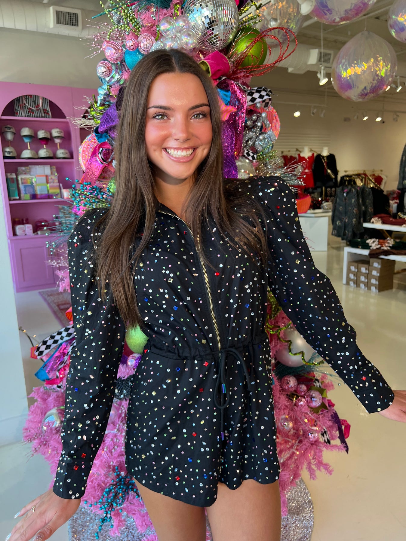 QOS Black Rhinestone Longsleeve Romper