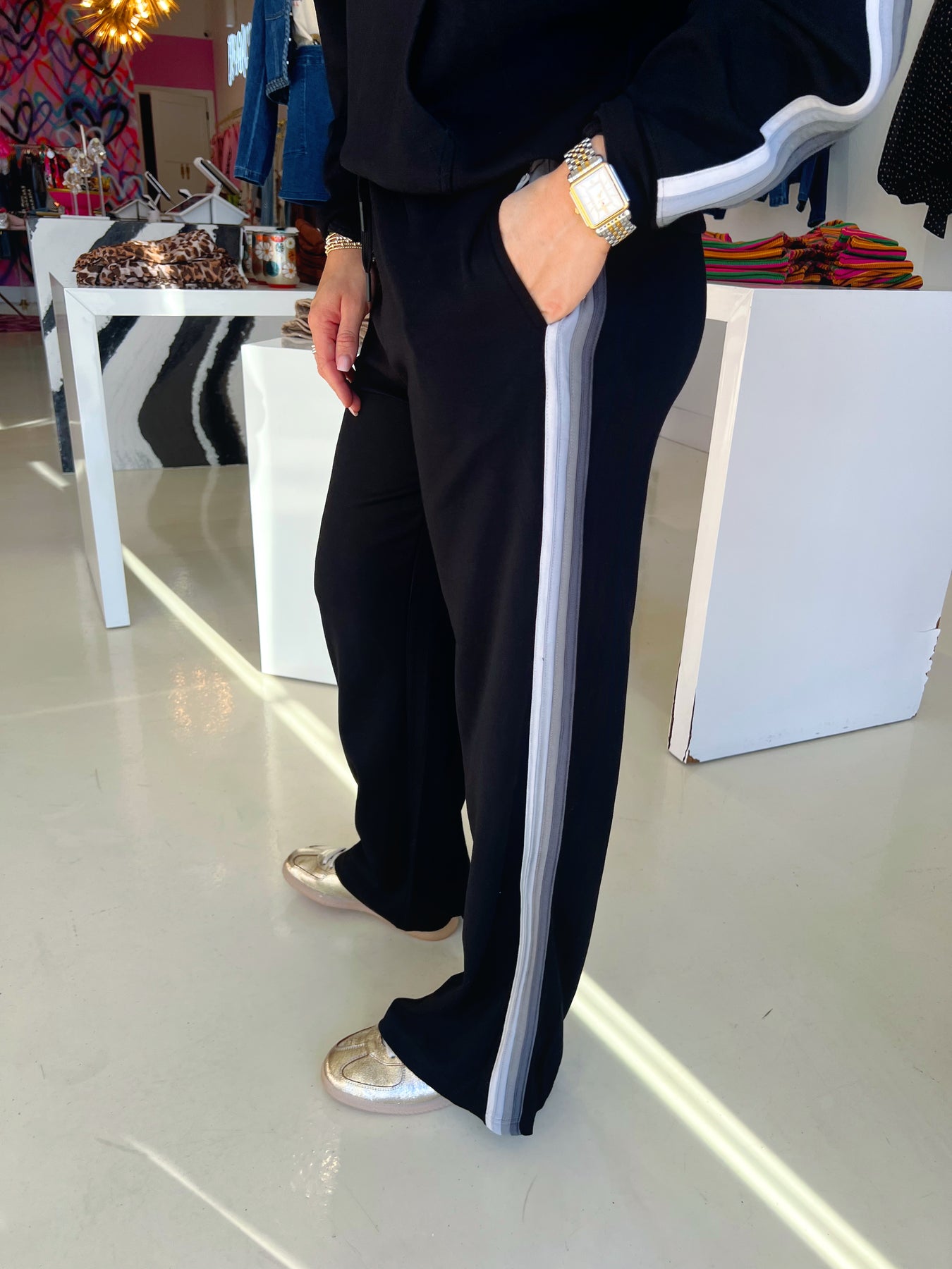 Black Cloud Fleece W/ Grey Striped Wide Leg Pants